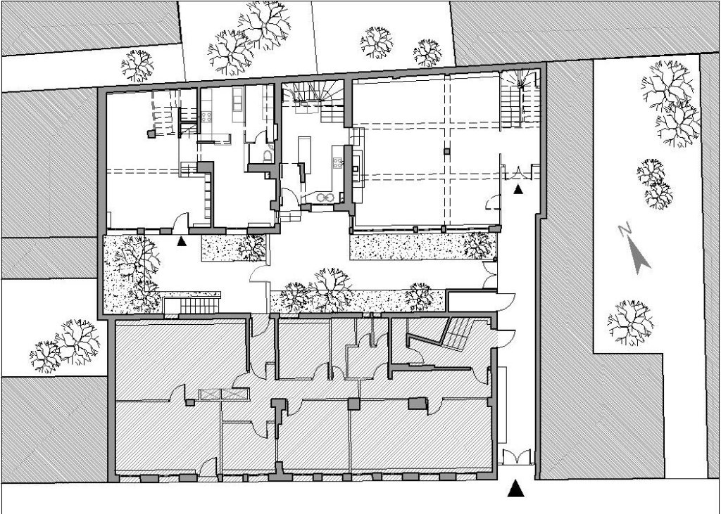 La partie majeure de la transformation tourne autour de trois points importants : l’évolution d’une courette délaissée en jardins conviviaux et privatifs, la découverte des espaces dissimulés sous la pente des toitures et le désir de structurer la vie quotidienne autour des « espaces conviviales » plutôt que « pièces à une fonction ».