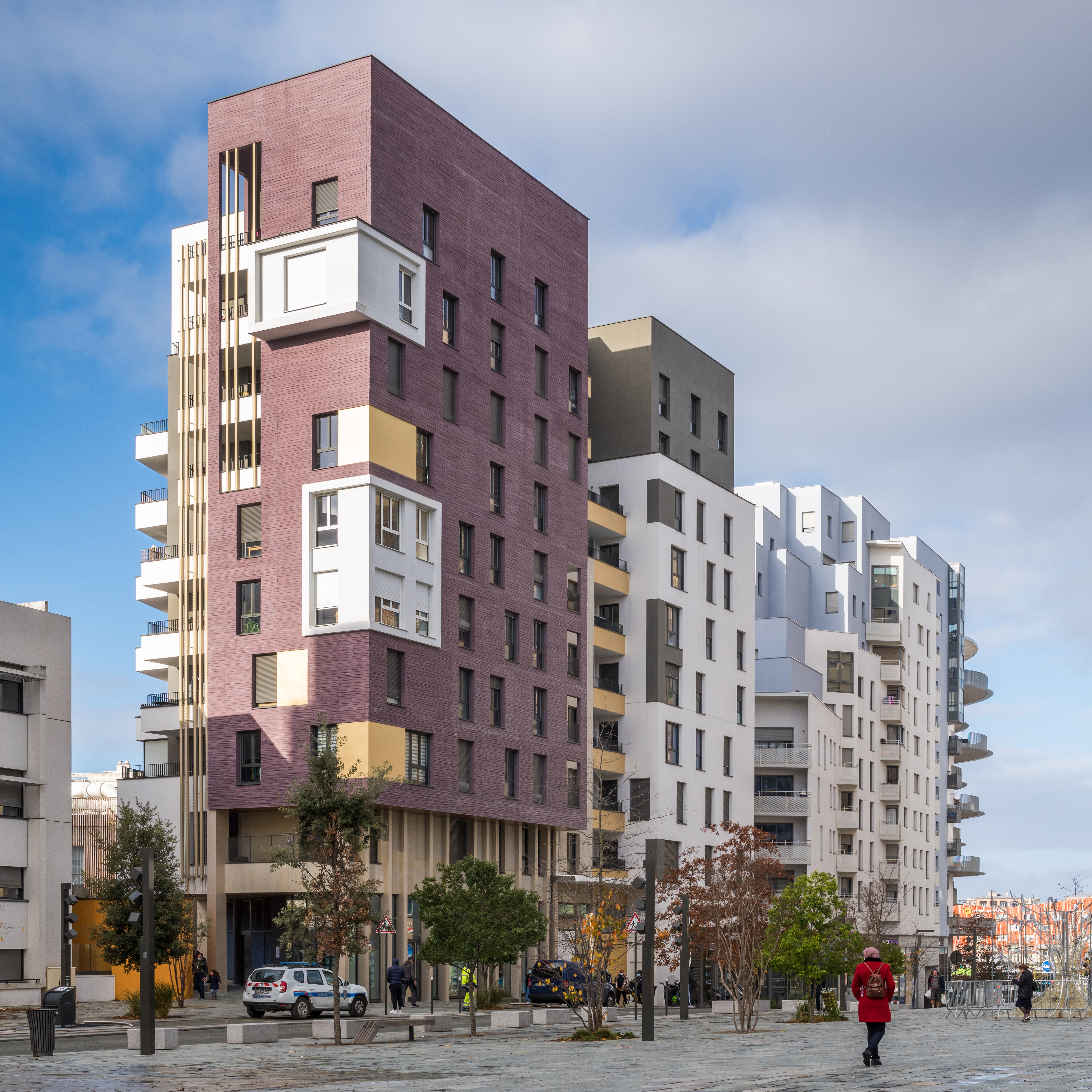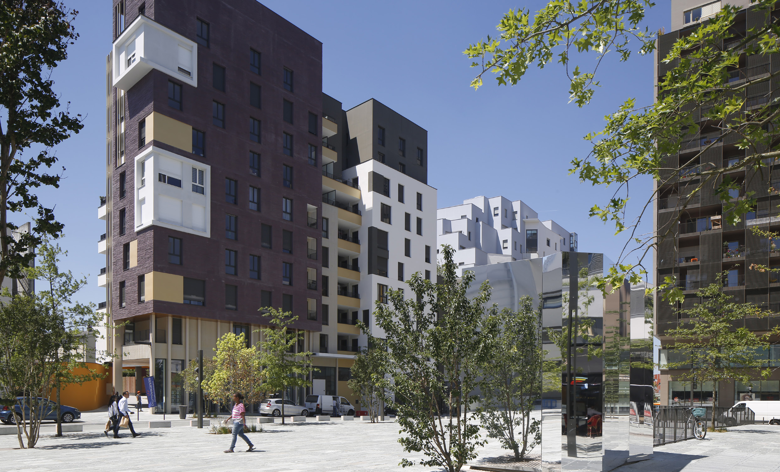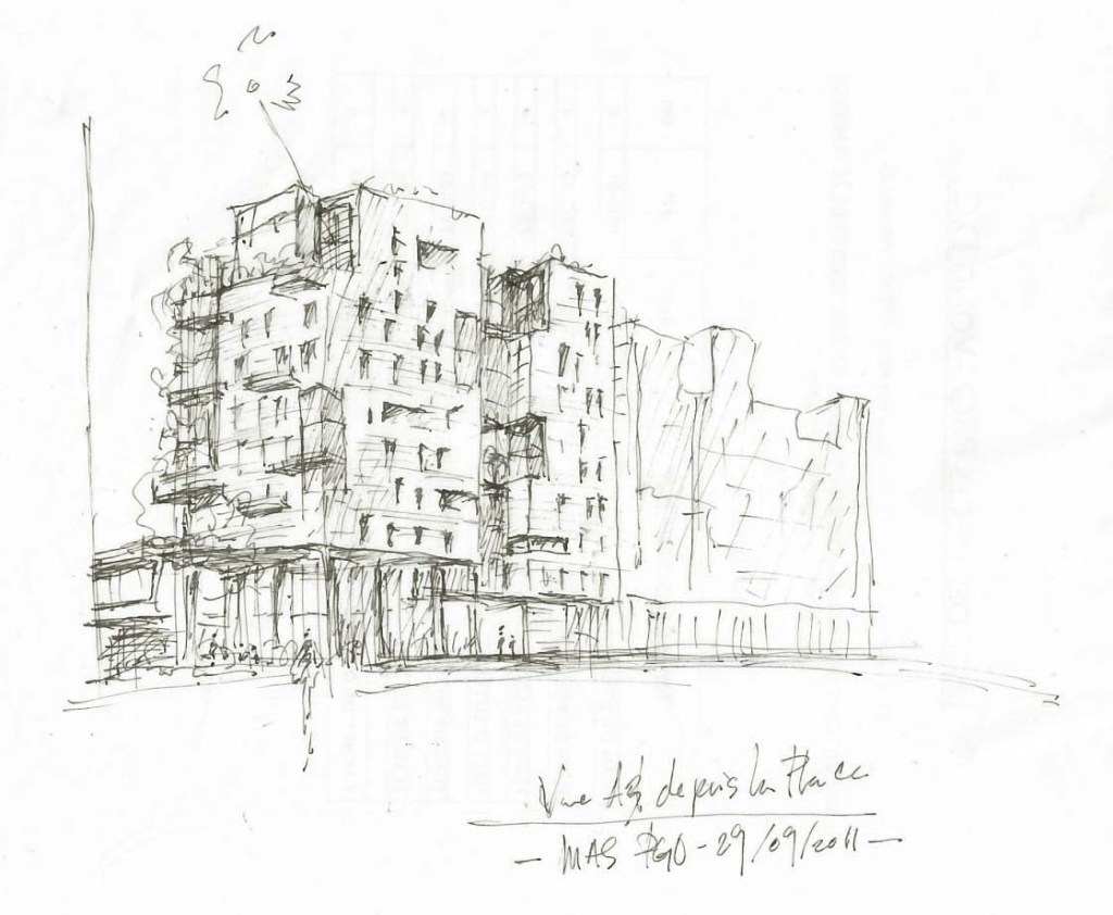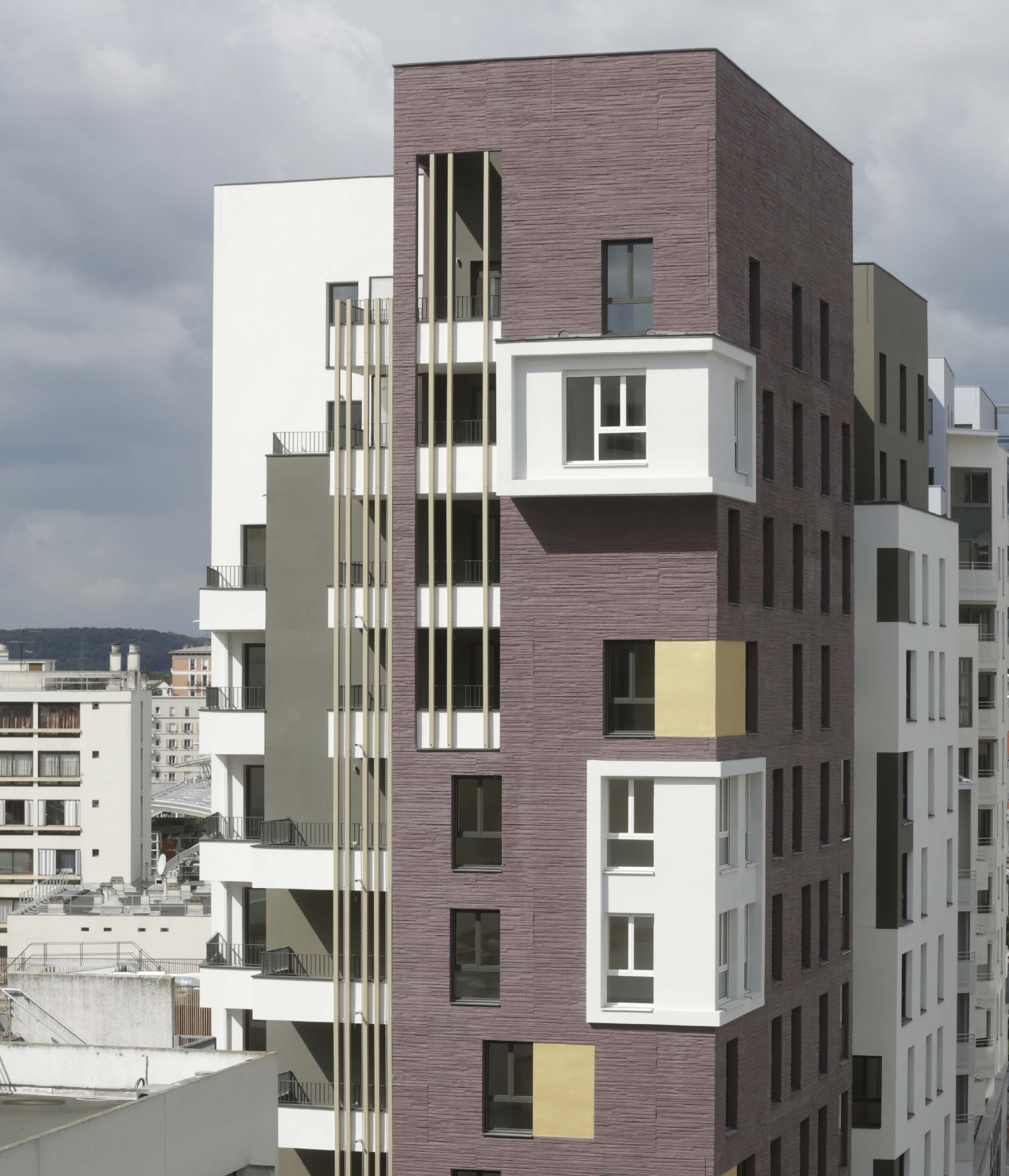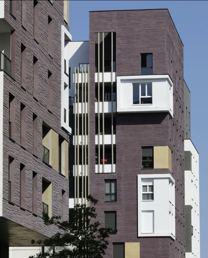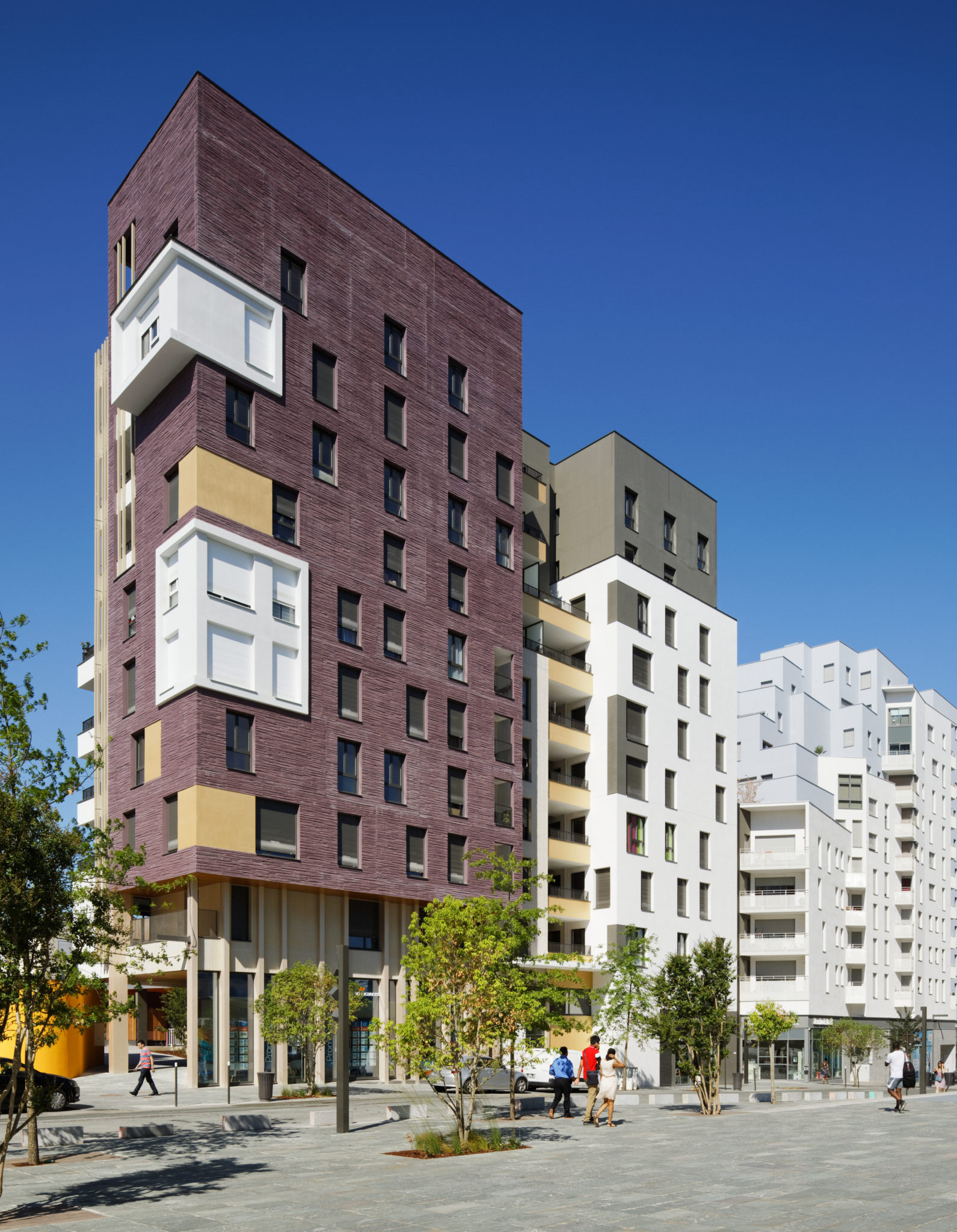 Les deux immeubles d’habitations, haut de neuf étages, expose du côté de l’école une façade blanche et lumineuse. Ils affirment davantage leur solennité sur la place avec un habillage de béton matricé lie de vin rehaussé de boite blanche en saillie et de cadres dorées.
