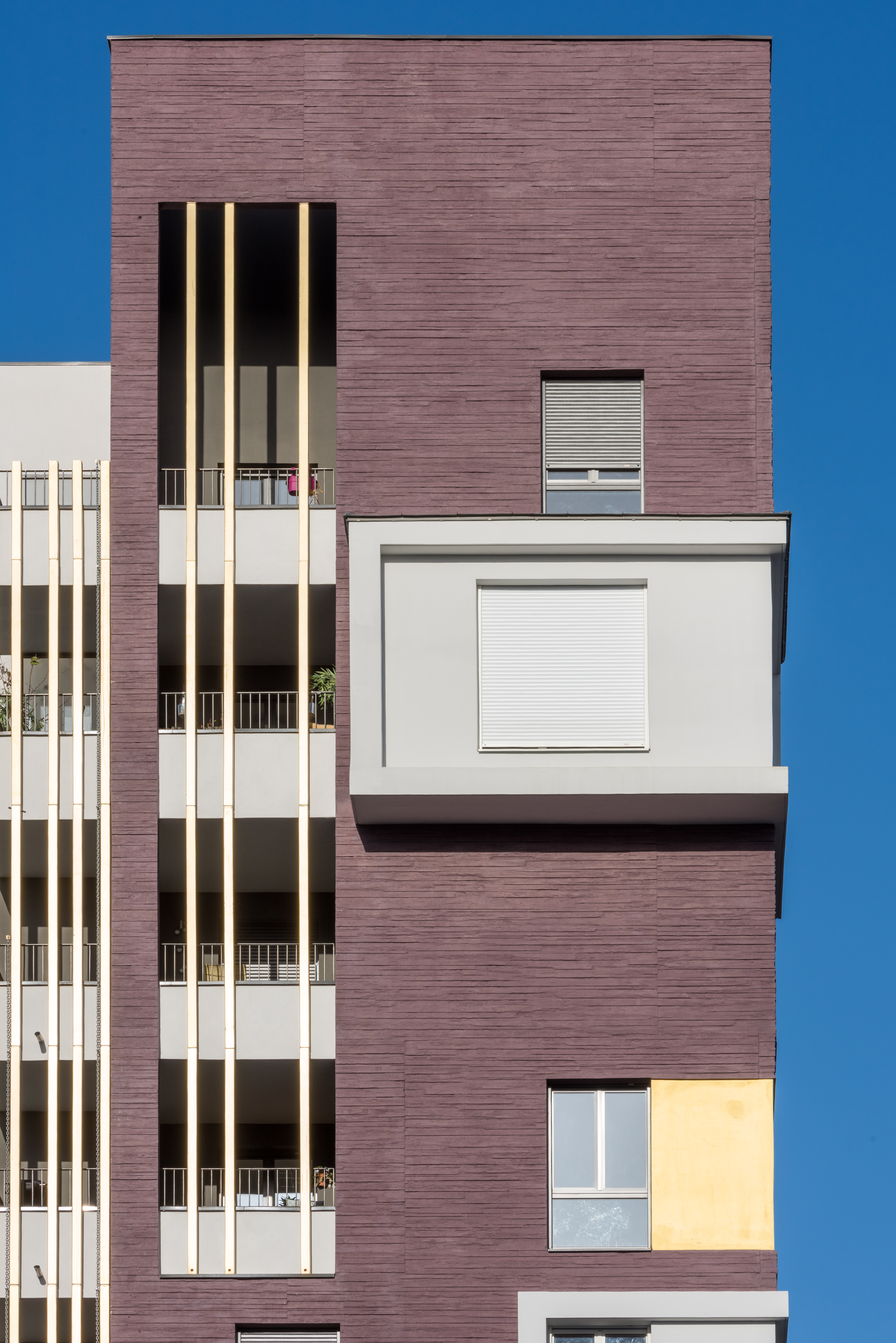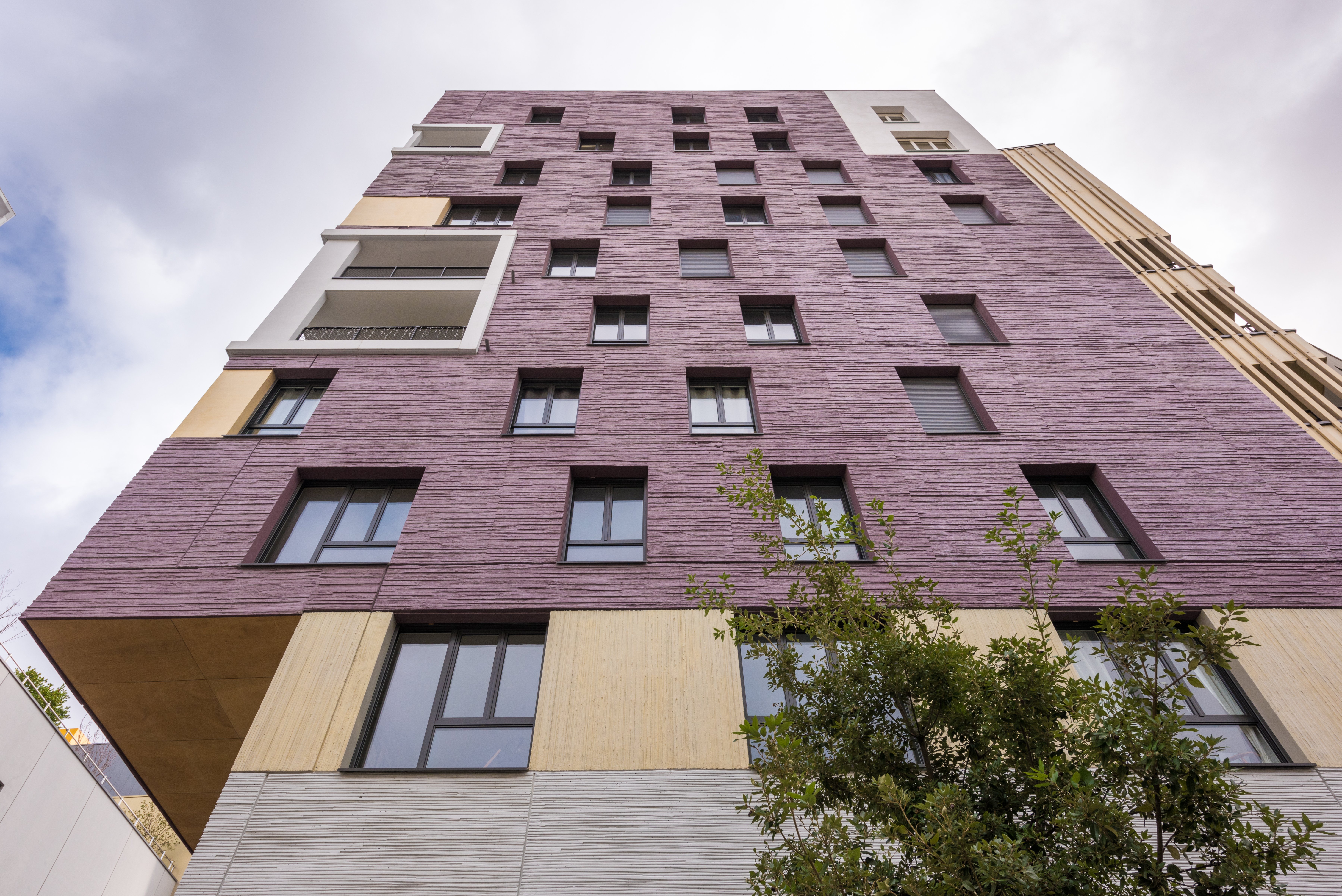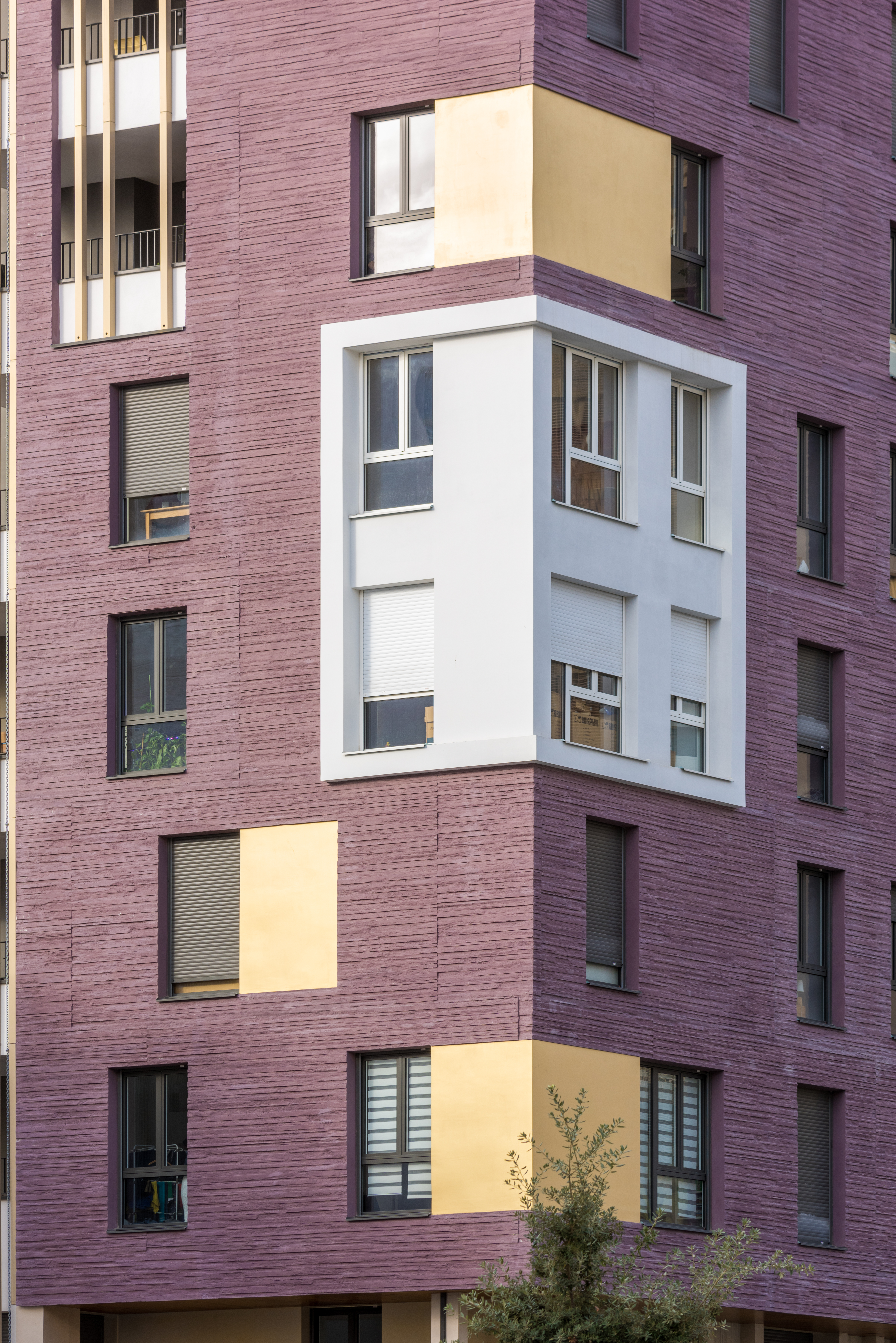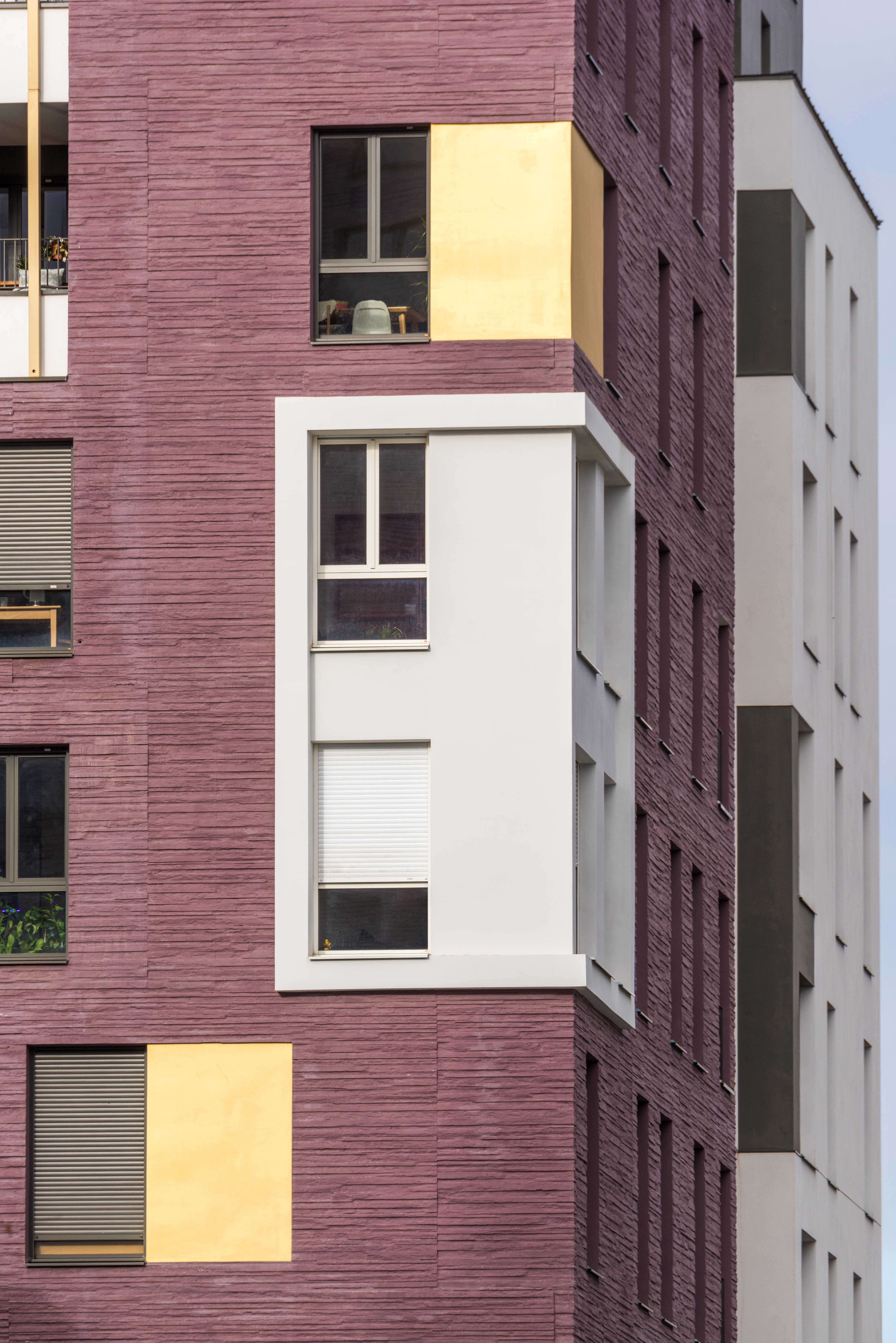 Les deux immeubles d’habitations, haut de neuf étages, expose du côté de l’école une façade blanche et lumineuse. Ils affirment davantage leur solennité sur la place avec un habillage de béton matricé lie de vin rehaussé de boite blanche en saillie et de cadres dorées.