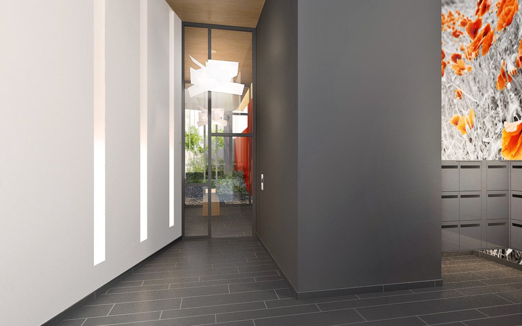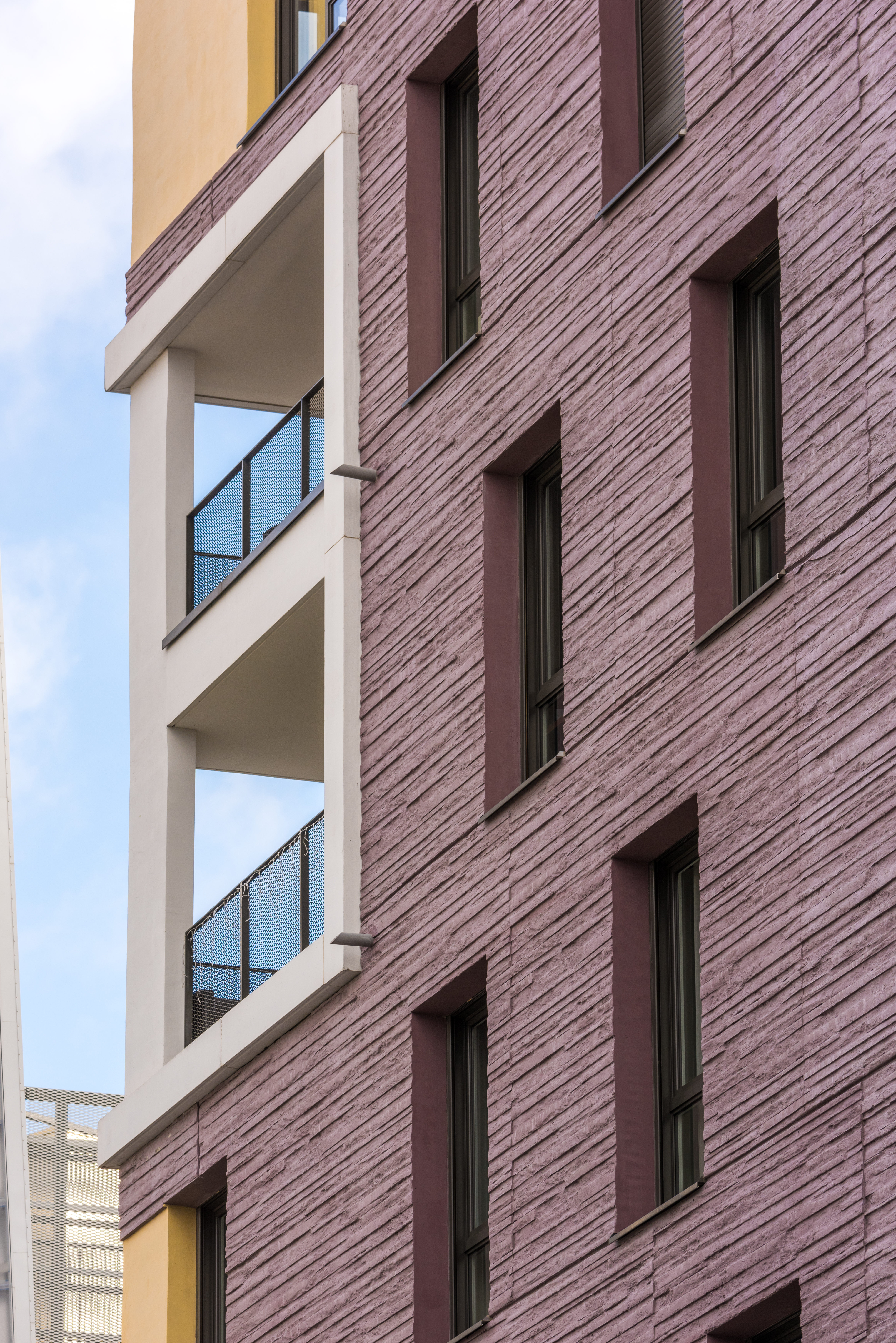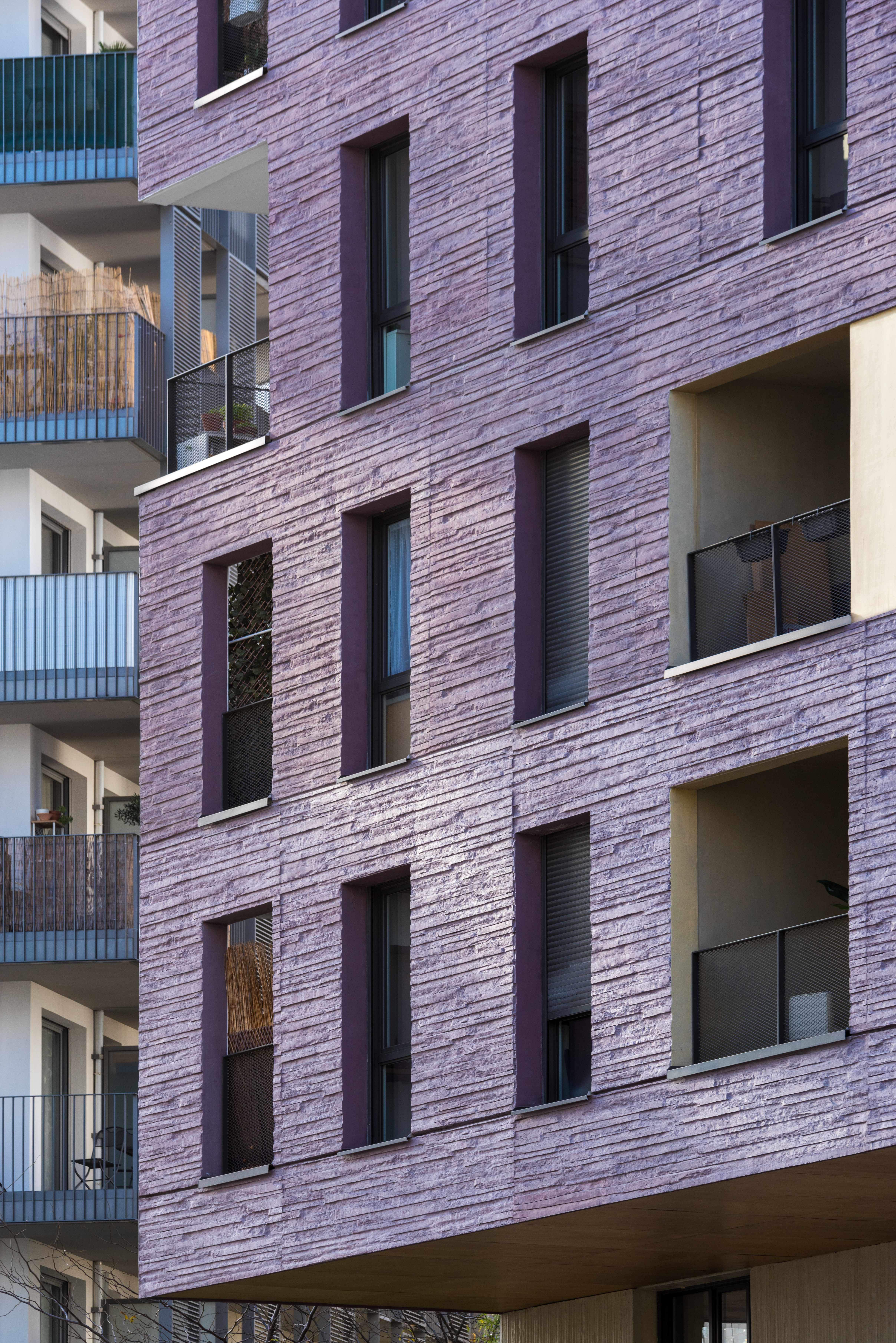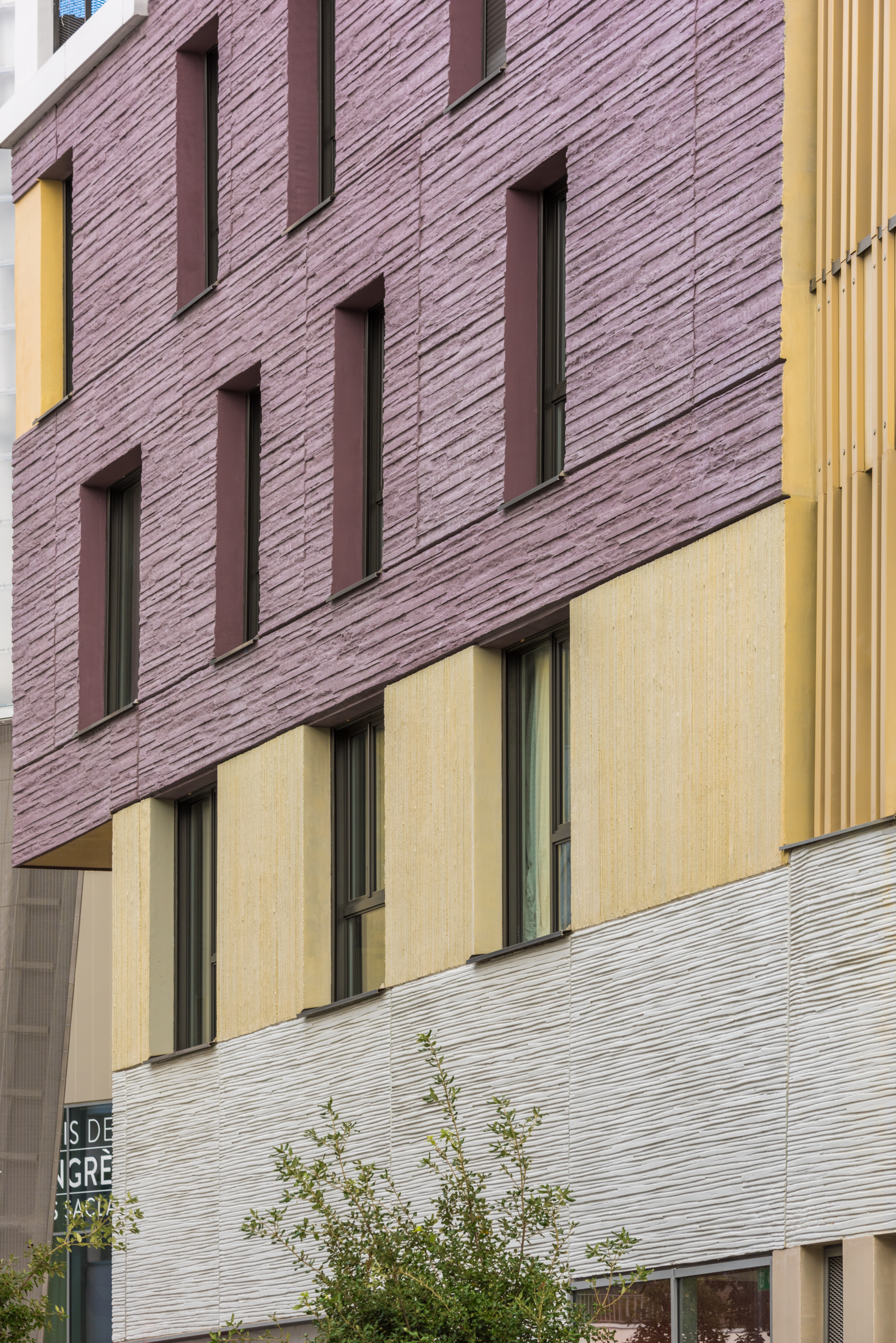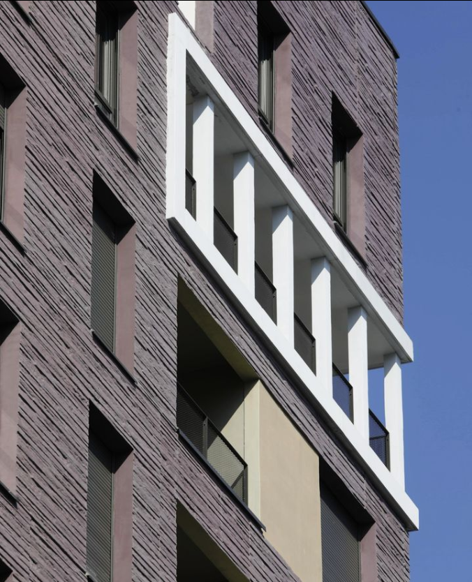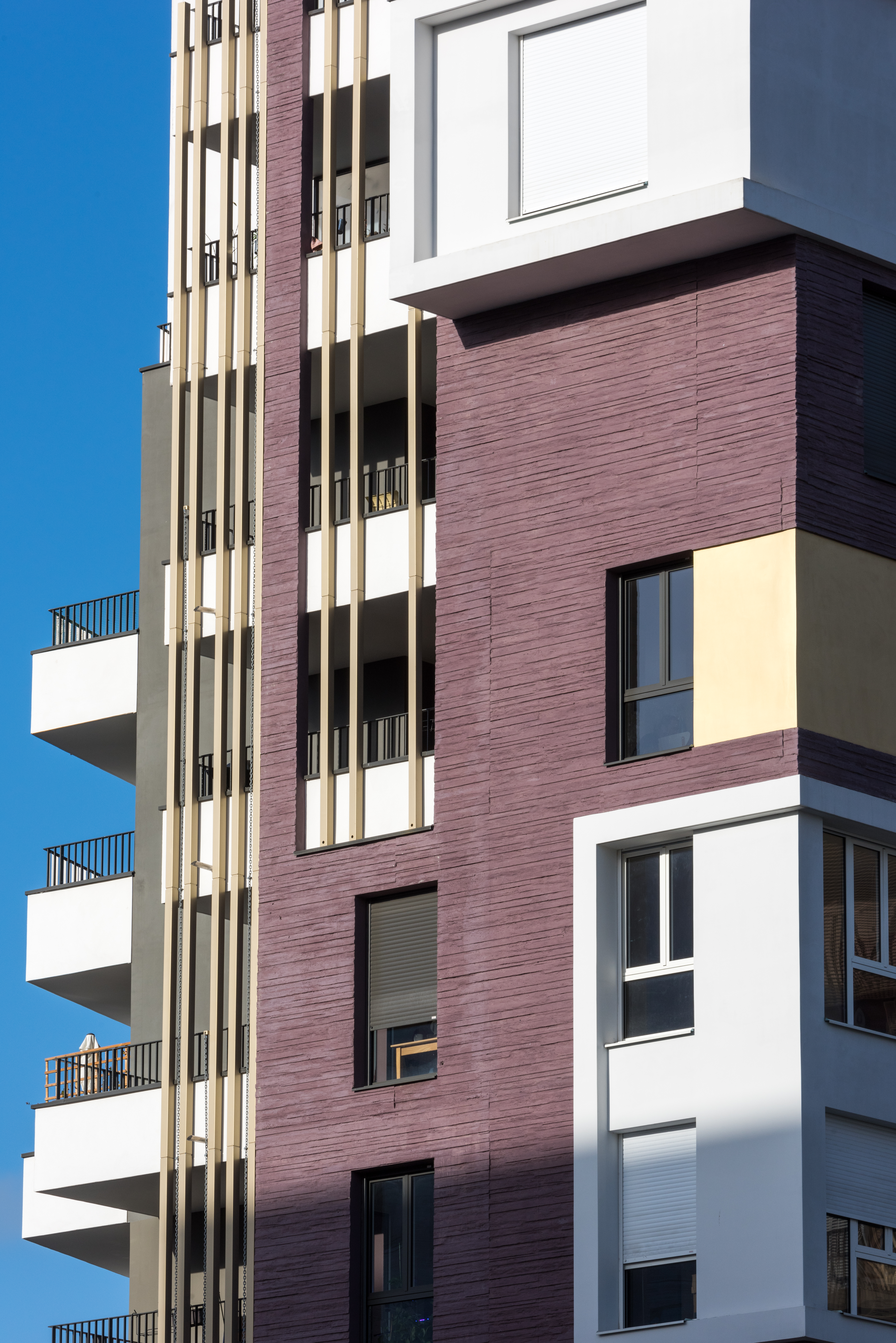 Les deux immeubles d’habitations, haut de neuf étages, expose du côté de l’école une façade blanche et lumineuse. Ils affirment davantage leur solennité sur la place avec un habillage de béton matricé lie de vin rehaussé de boite blanche en saillie et de cadres dorées.