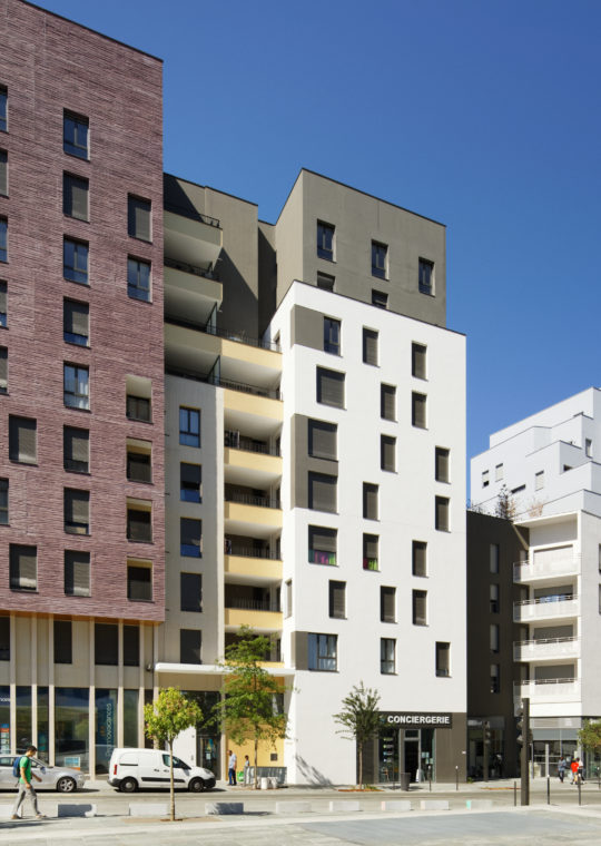 Les bâtiments A3 et B1 forment chacun un totem de part et d’autre de la rue Vasco de Gama avec l’école à leur pied. Le retrait ménagé entre les niveaux RDC et R+1, permet d’affirmer le soulèvement des bâtiments.