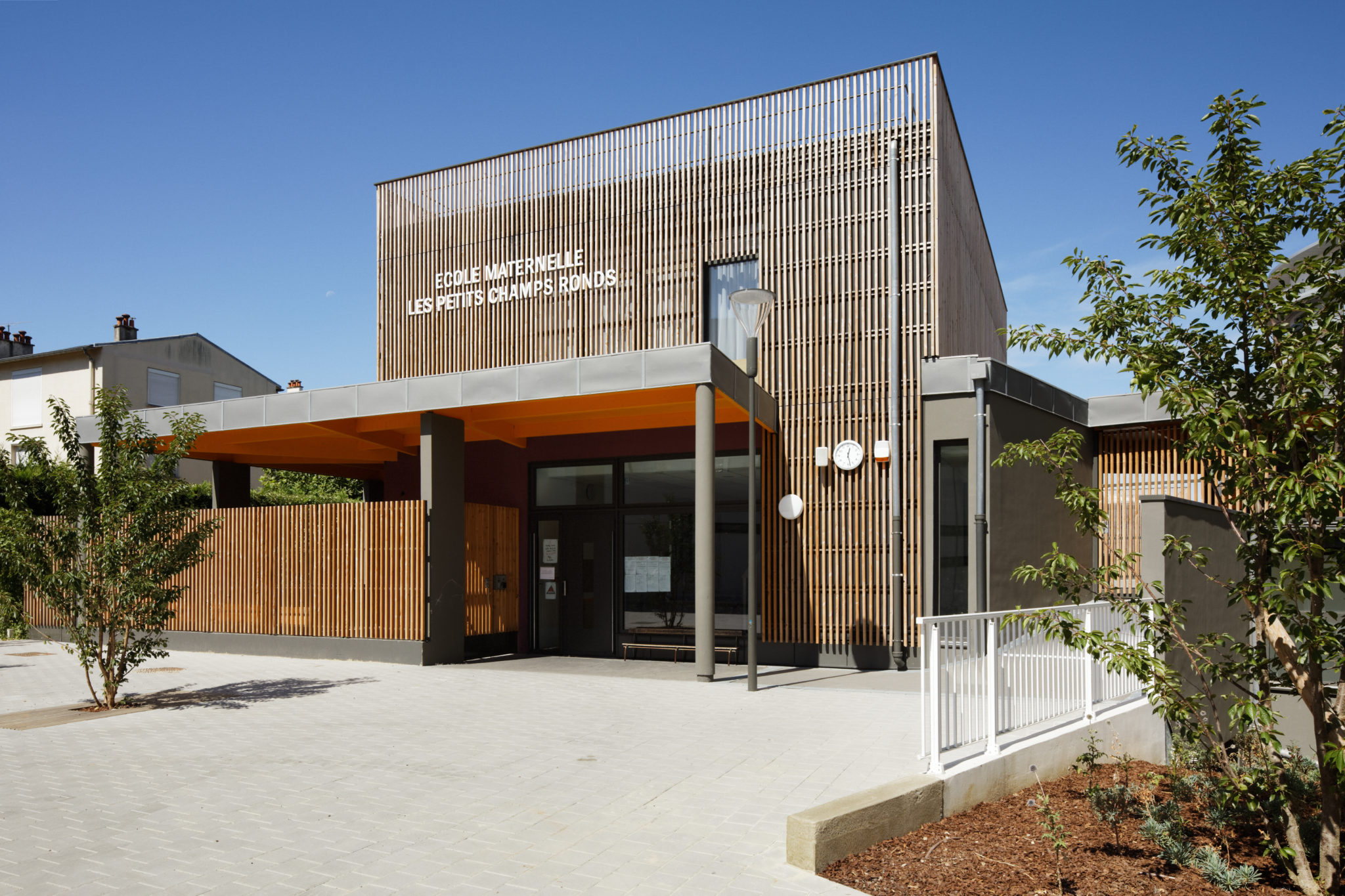 Les réflexions de Julie Howard & Sam Mays les ont conduit à travailler un double principe d’encadrement et d’ouverture ; encadrer les écoles dans un jeu réglé d’ouverture vers la lumière – la nature – le ciel, leur donner un rôle de première importance, une lisibilité évidente depuis la place principale, cœur du quartier