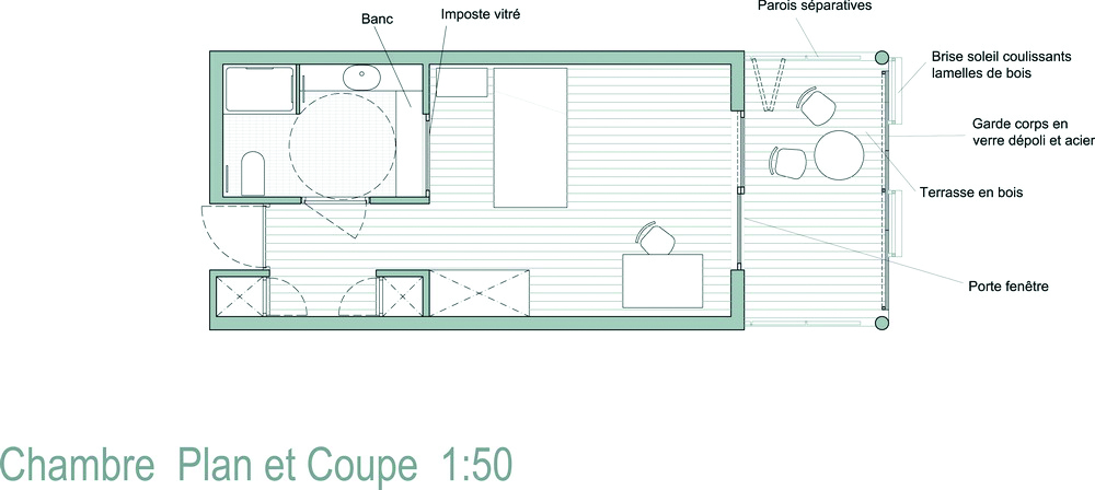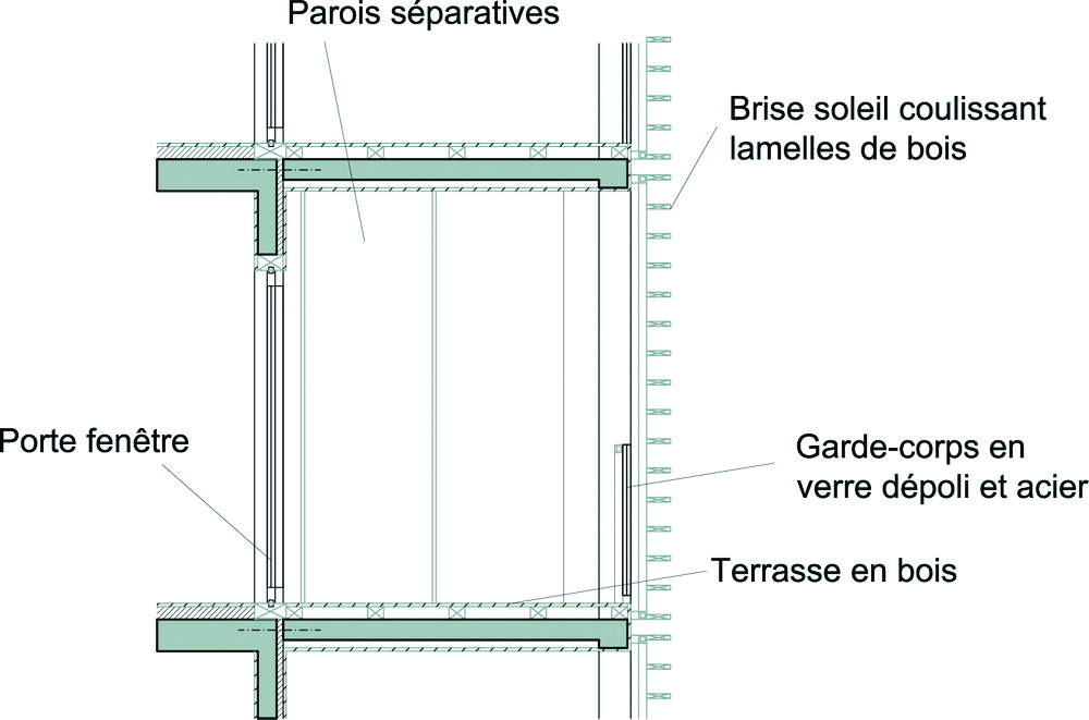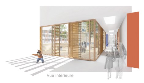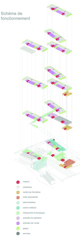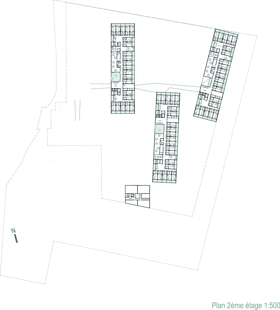 Des passerelles relient chaque bâtiment, ces lieux de passages deviennent des lieux de vie recevant les espaces communs tels que salles polyvalentes, salle à manger.