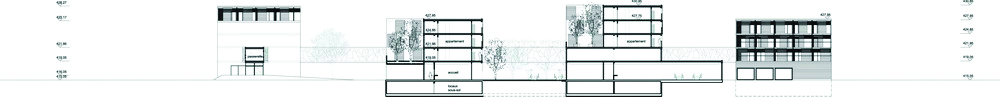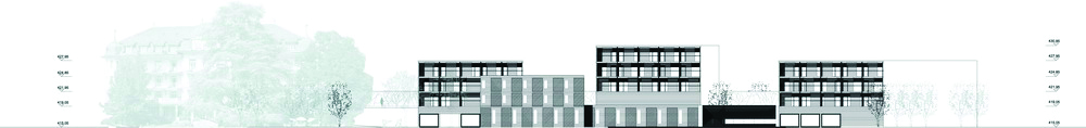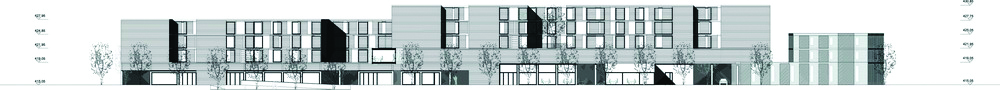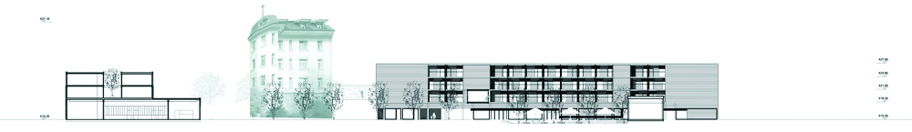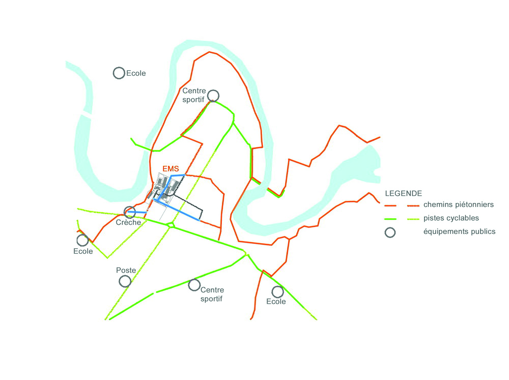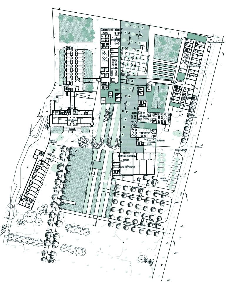 Recevant plusieurs activités, la bande fonctionnelle dessert le centre de formation, la salle polyvalente, le jardin privatif, la chapelle et le quai de livraison. L’EMS s’avance et s’intègre dans le nouveau centre, volonté de s’ouvrir au quartier.